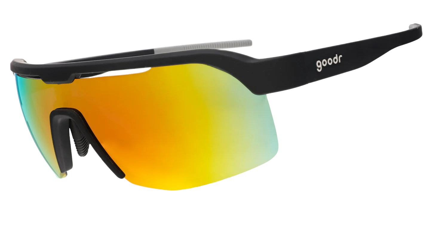 Deze zwarte zonnebril met half montuur en brandoranje reflecterende lenzen zal niet uitglijden of stuiteren als je de bal verslaat en dat prompt laat volgen door een legendarische overwinningsdans in de endzone die alleen kan worden beschreven als een twerkout.