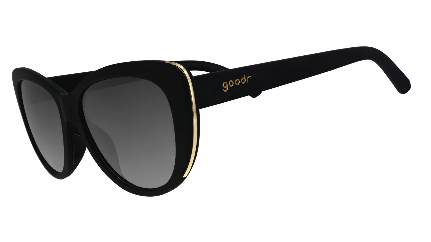Deze zwarte cat-eye zonnebril met zwarte niet-reflecterende glazen & lichtgouden accenten geeft een mode-icoon. Glijdt niet uit en stuitert niet als je over de catwalk of het trottoir loopt.